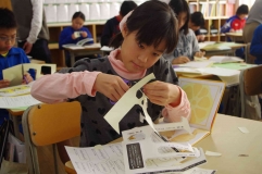 活動先のひとつ盛小学校では、子どもたちはカンボジア向けの絵本に挑戦し、クメール語で書かれた文字シールを台紙から切り取り、丁寧に日本語の上に貼っていきました。また、活動をはじめる前に、カンボジアについて1年ほど現地にいらした公益社団法人シャンティ国際ボランティア会の岩手事務所の方から、なぜこのボランティア活動が必要なのかなど話しを聞く時間を設けることで、子どもたちにとって国際理解を深める機会にもなったようです。