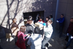 下の写真は、積込みの作業をしているところです。集められた本は、約13,000冊で、段ボール一箱に60冊程の絵本が入り、重さは20キロ前後になります。合計で258個の段ボールをこの活動に参加している企業ボランティアの方やシャンティ職員の方が、倉庫からトラックの荷台まで列を作り、リレーし運びました。