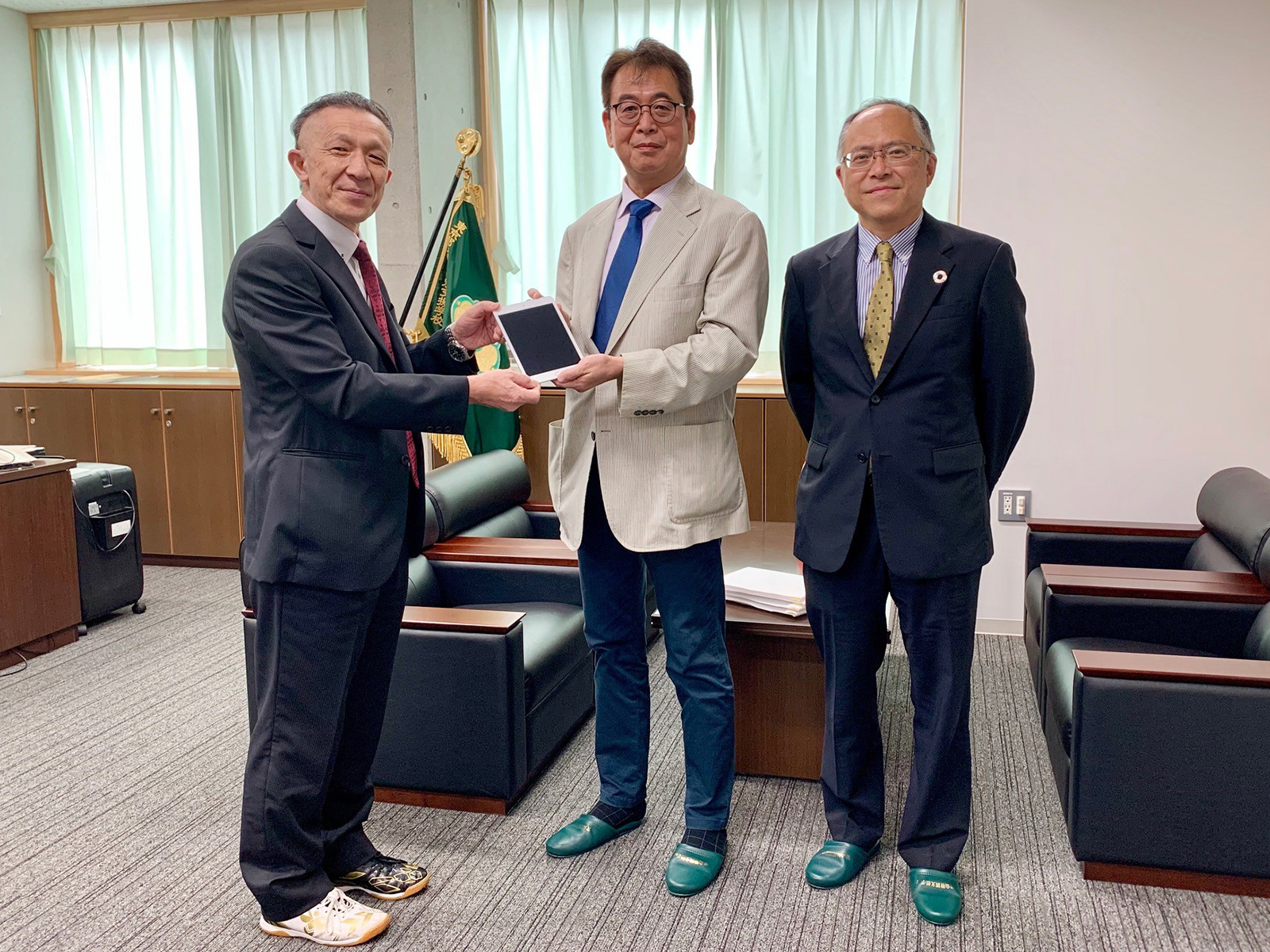 (写真左(一枚目) 左から:青山特別支援学校 吉井校長、伊藤忠記念財団 石田常務理事、伊藤忠商事サステナビリティ推進室 田部室長)